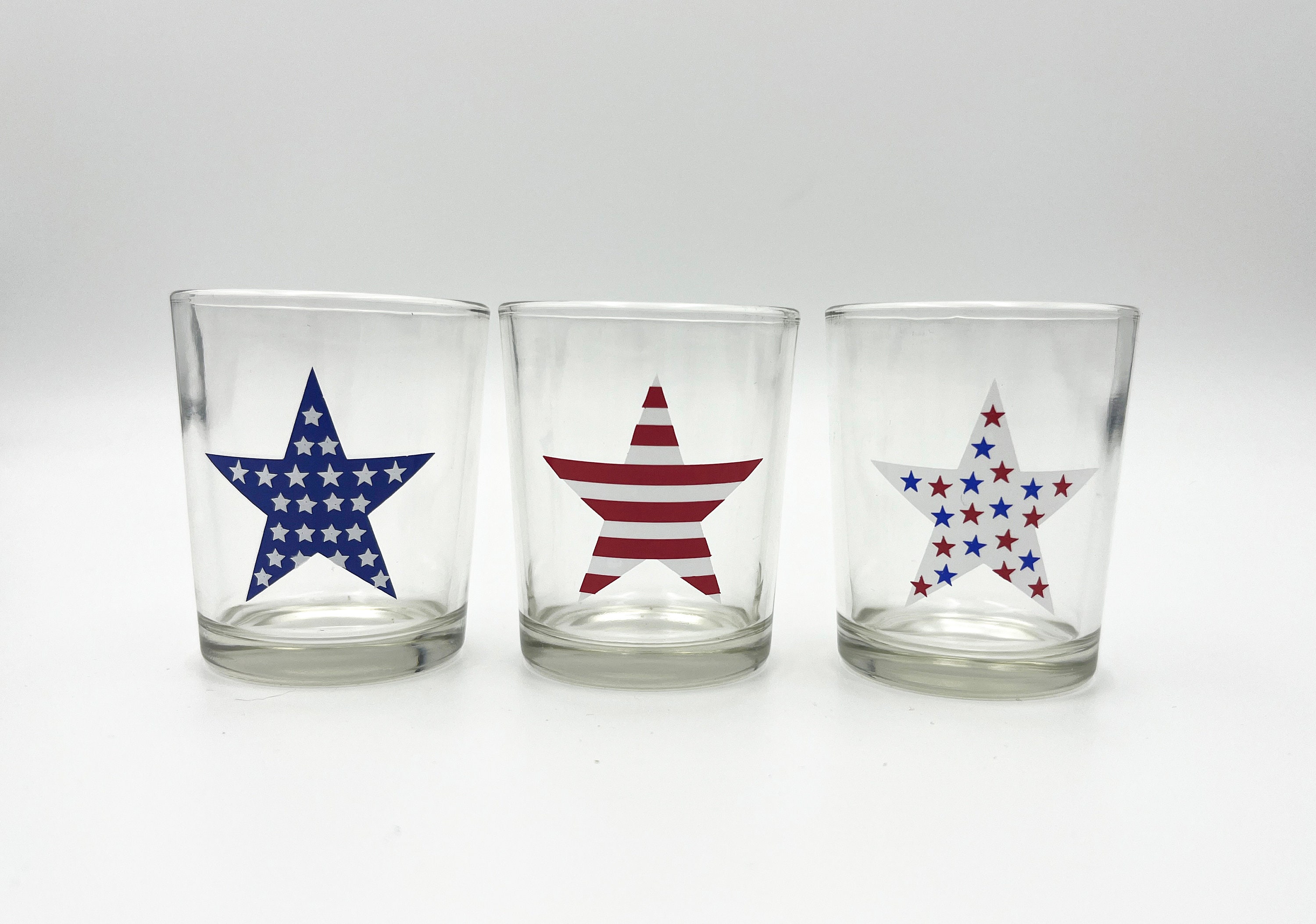 The frosted glass votive candle holder set features 3 different hand painted stars. The clear votive candle set features 3 different stars done in permanent vinyl. The perfect addition to your 4th of July decor.