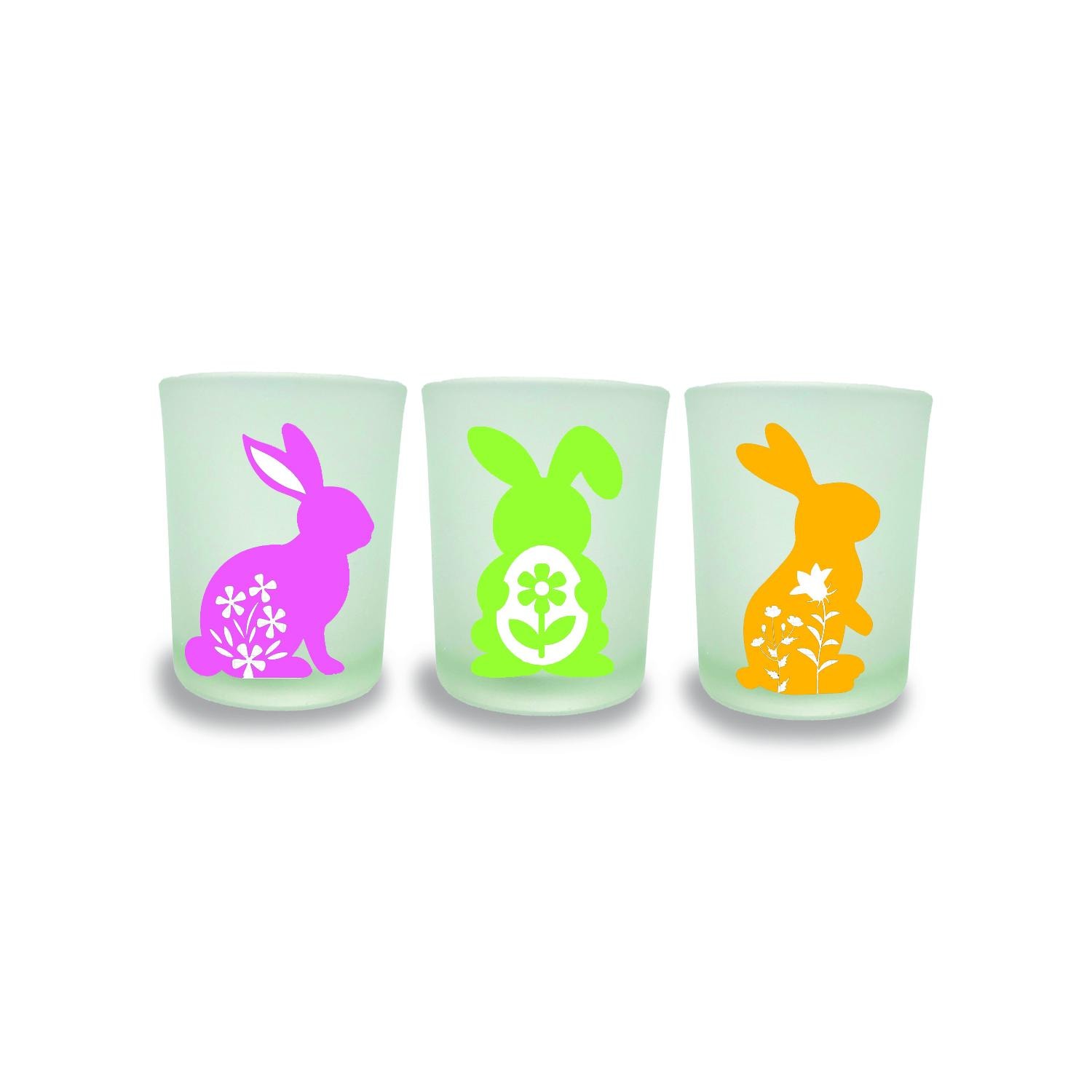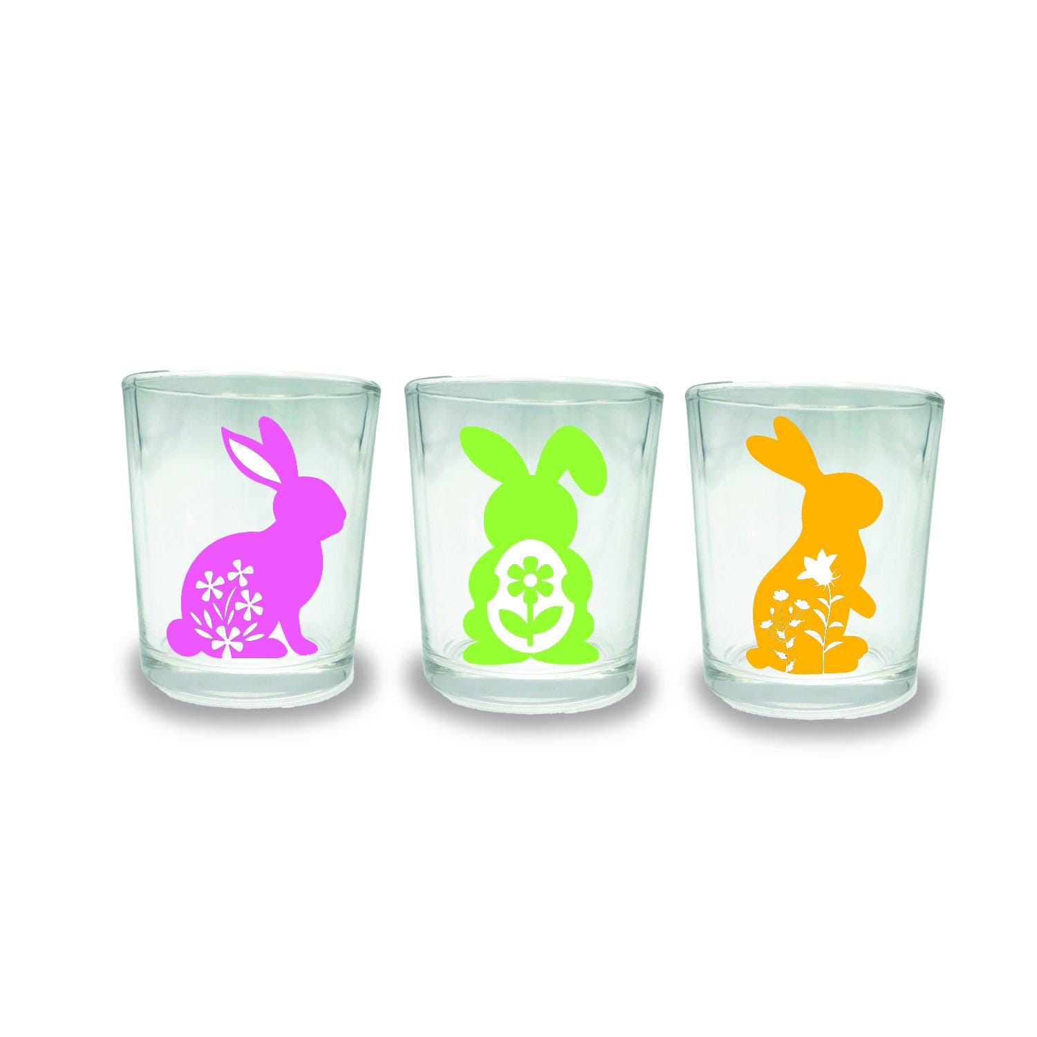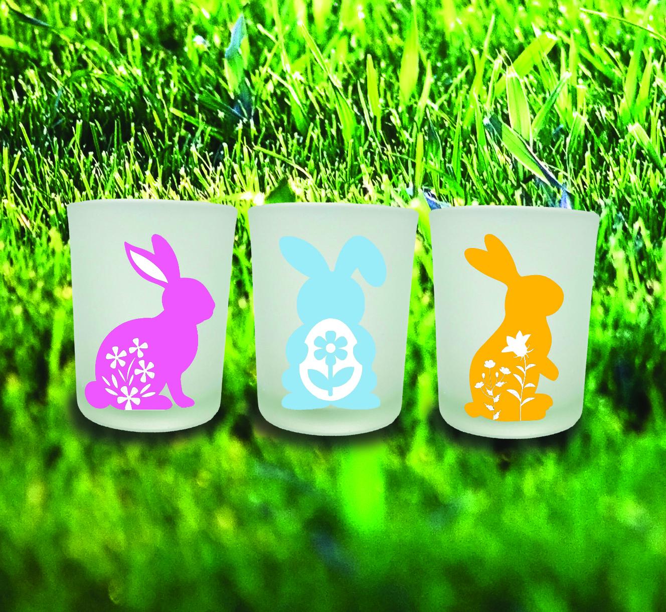 These frosted 2" x 2.5" extra thick premium quality glass votives are each decorated with 3 slightly different Easter bunny silhouettes in vinyl, have a tiny pom pom cottontail, and are covered with clear glitter.