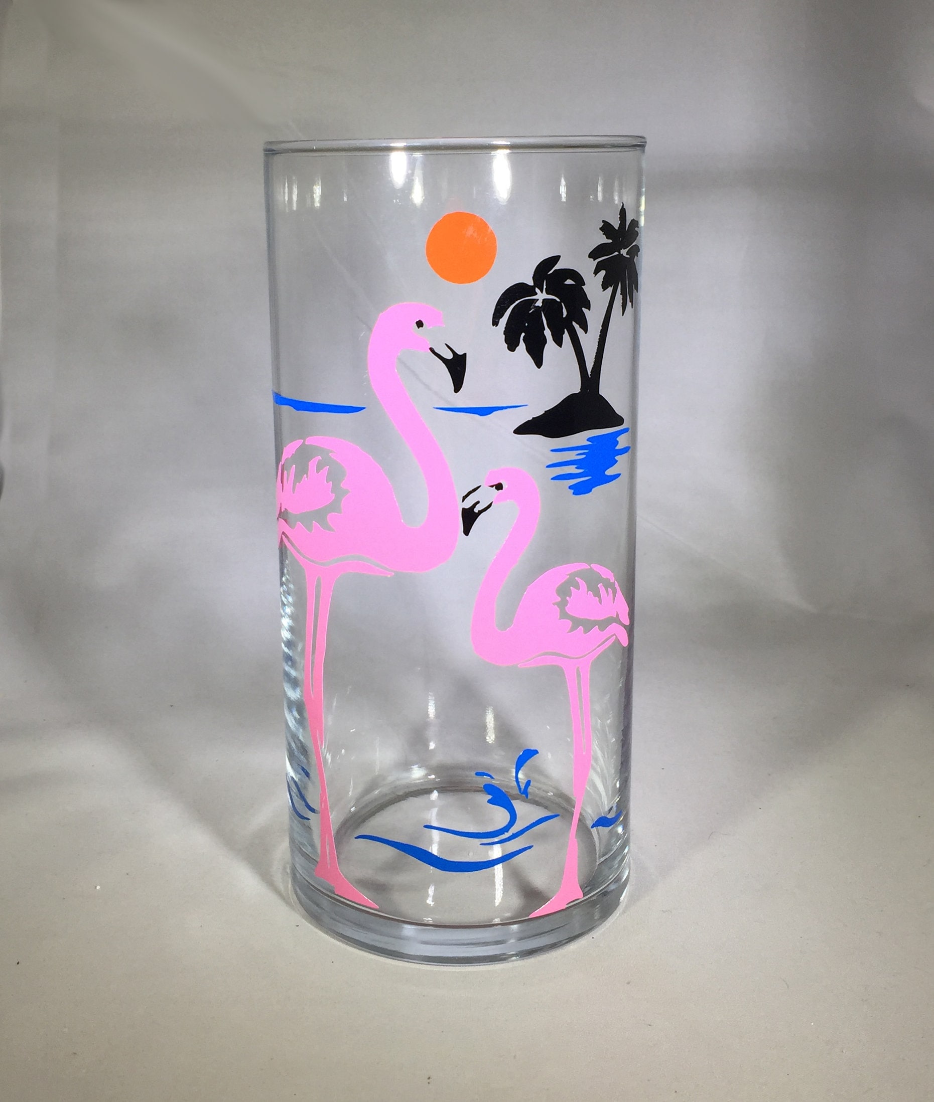 This 7.25 inch tall, 3.25 dia. cylinder vase features a flamingo design in vinyl. The contemporary cylinder design lends itself to a world of possibilities! Beautiful filled with a floral arrangement, equally striking with a floating candle, gemstones, rocks, or rose petals. Item will come gift wrapped in a white gift box with ribbon.