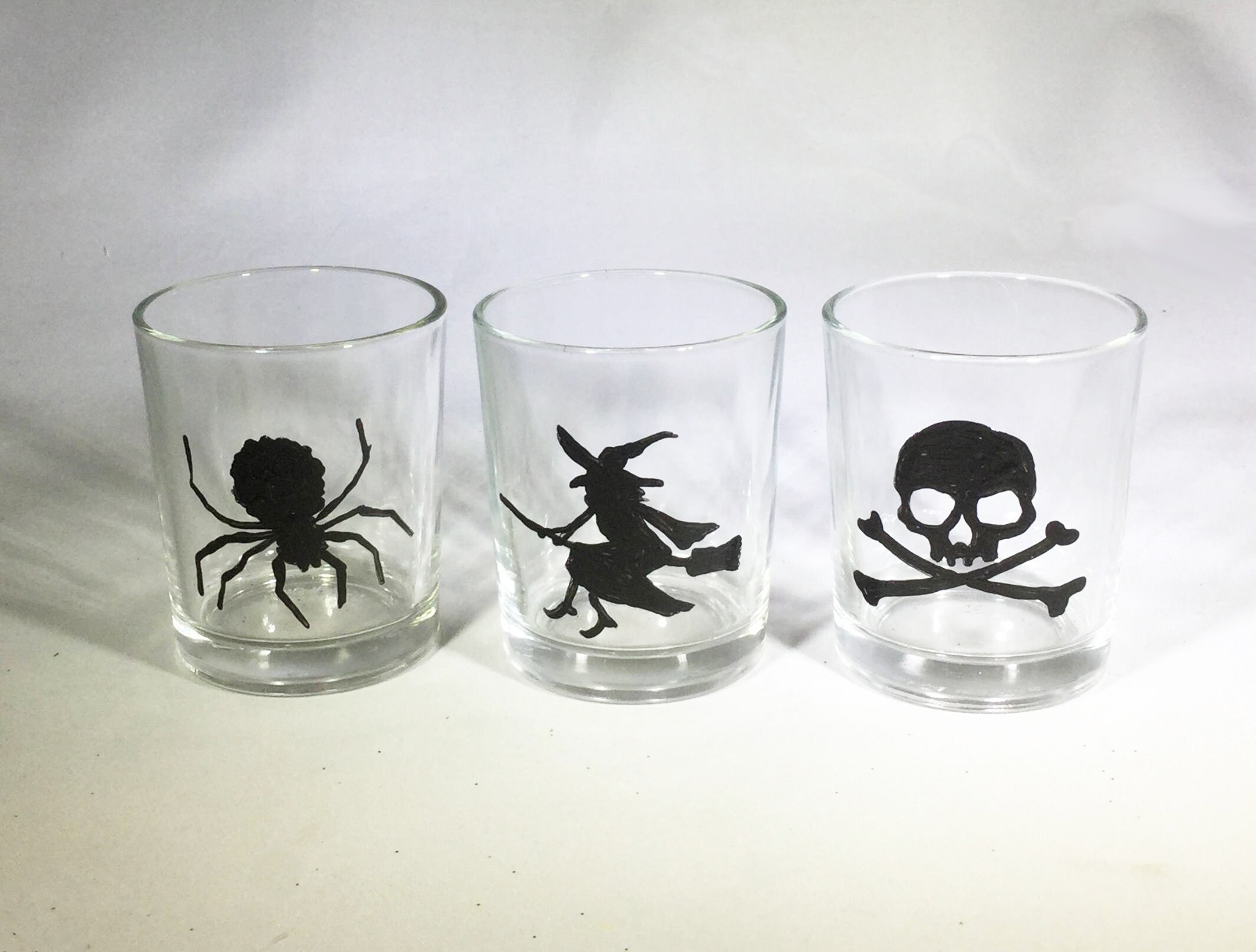 These clear 2" x 2.5" extra thick premium quality glass votives feature hand painted Halloween silhouettes.