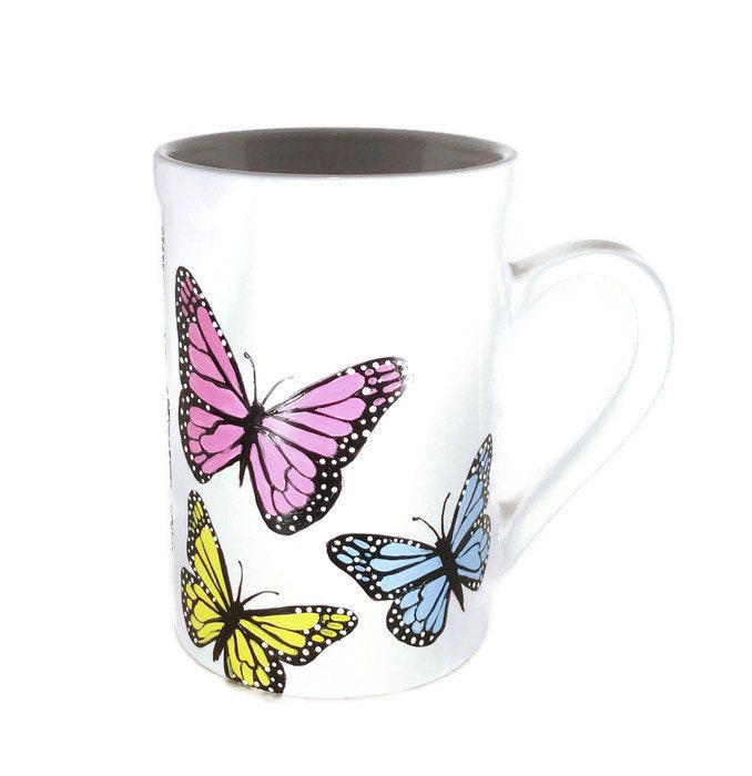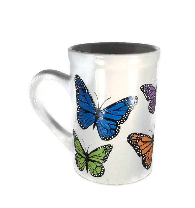 Make coffee and tea time a bit brighter with this beautiful solid-colored, hand painted ceramic mug. Shown is a white mug with colorful butterflies hand painted around the mug.