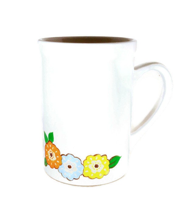 Make coffee and tea time a bit brighter with this beautiful solid-colored, hand painted ceramic mug. Shown is a white mug with a cute little owl and flowers hand painted around the mug.