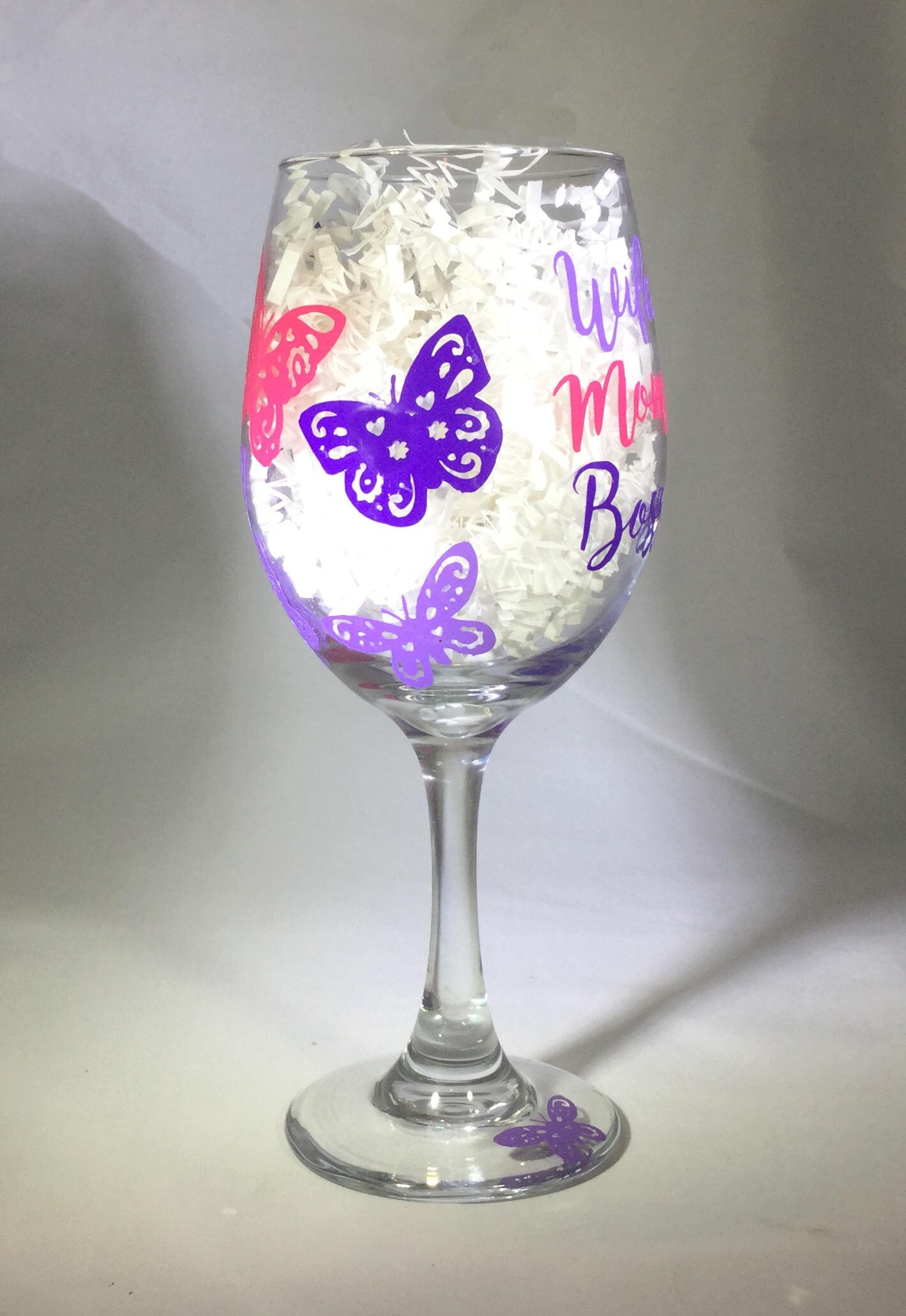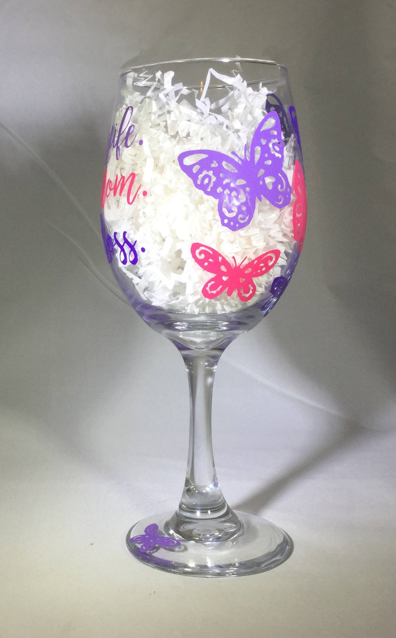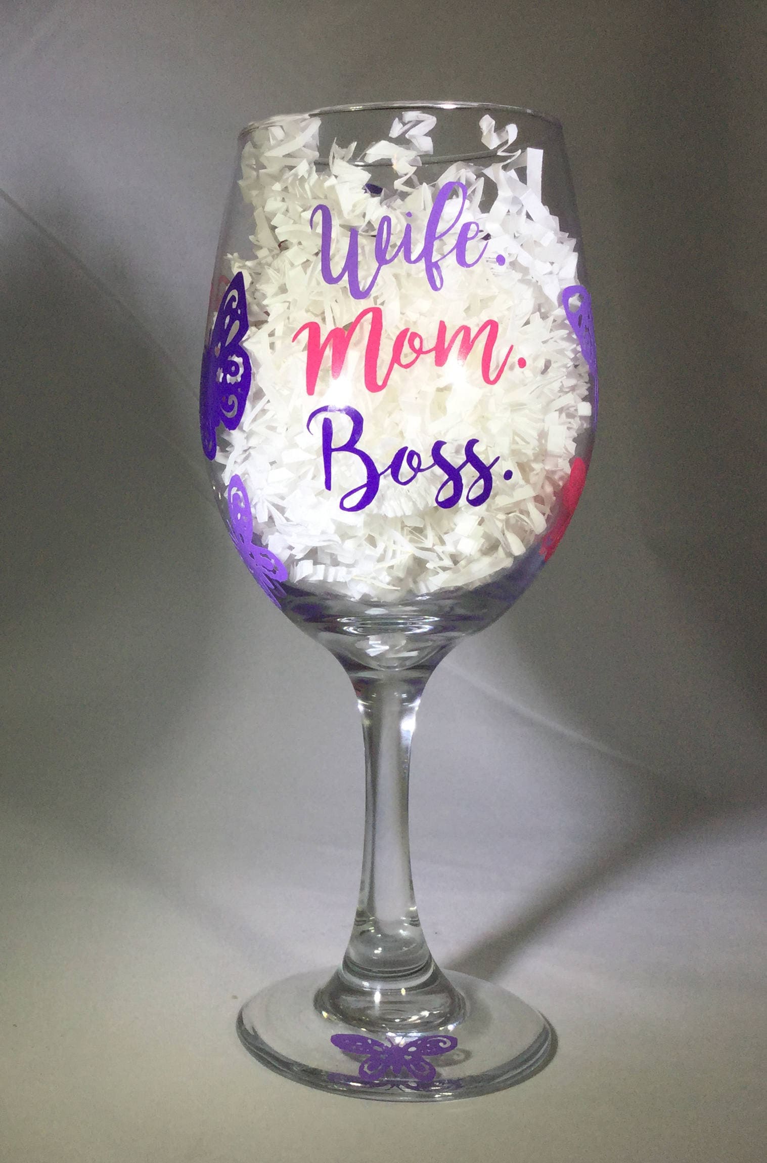 Wine glass for that special Wife, Mom, and of course Boss. Glass measures approximately 9" tall and holds 20 oz. Design done is vinyl. Hand wash.