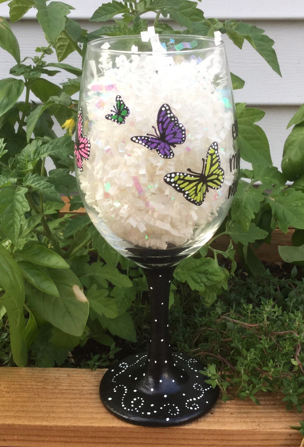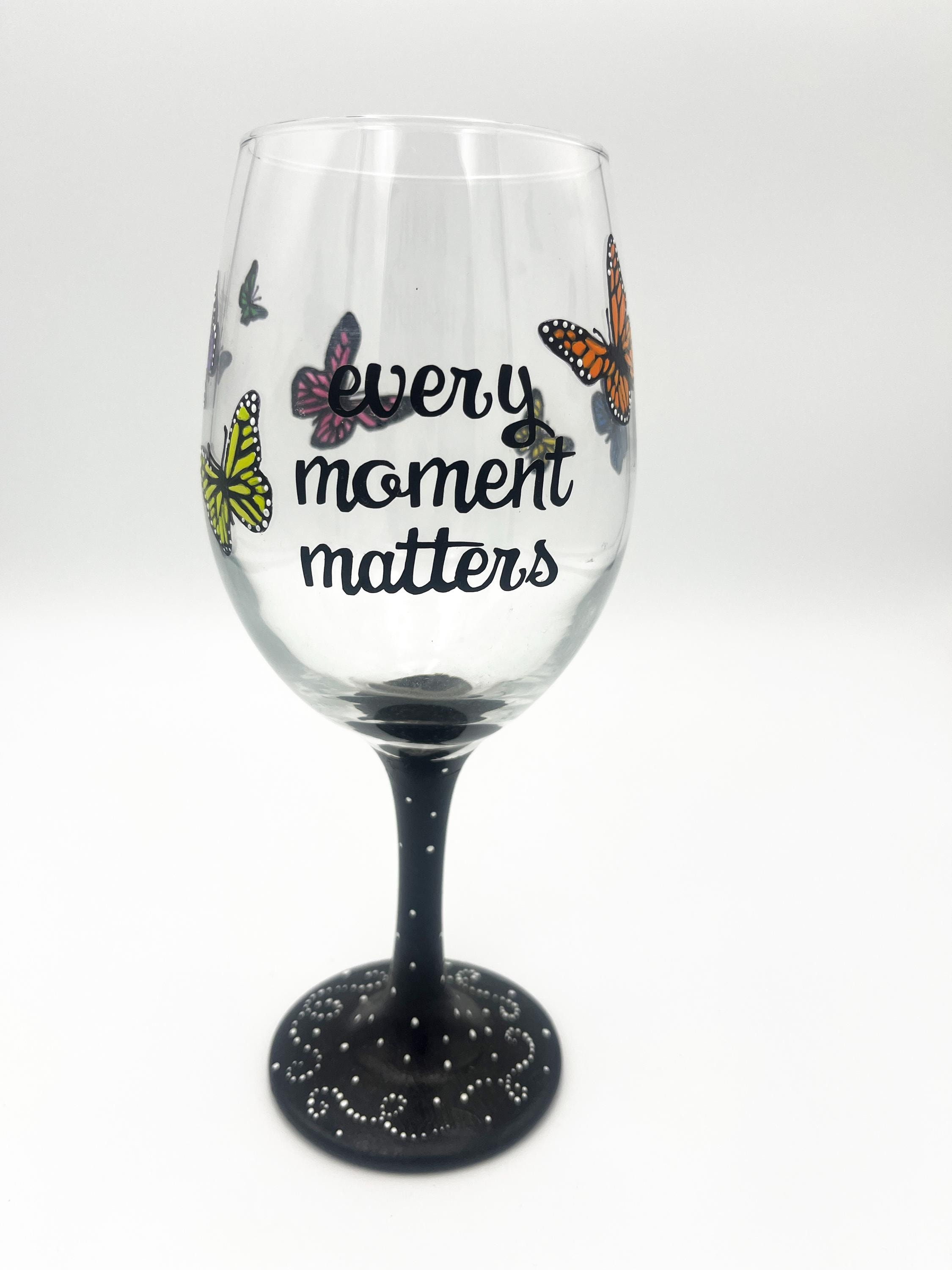 Wine glass with "every moment matters" on the front and hand painted butterflies around sides and back. Glass measures approximately 9" tall and holds 20 oz. Hand painted with enamel paint. Hand washing is recommended. Glass can be personalized at no additional cost.