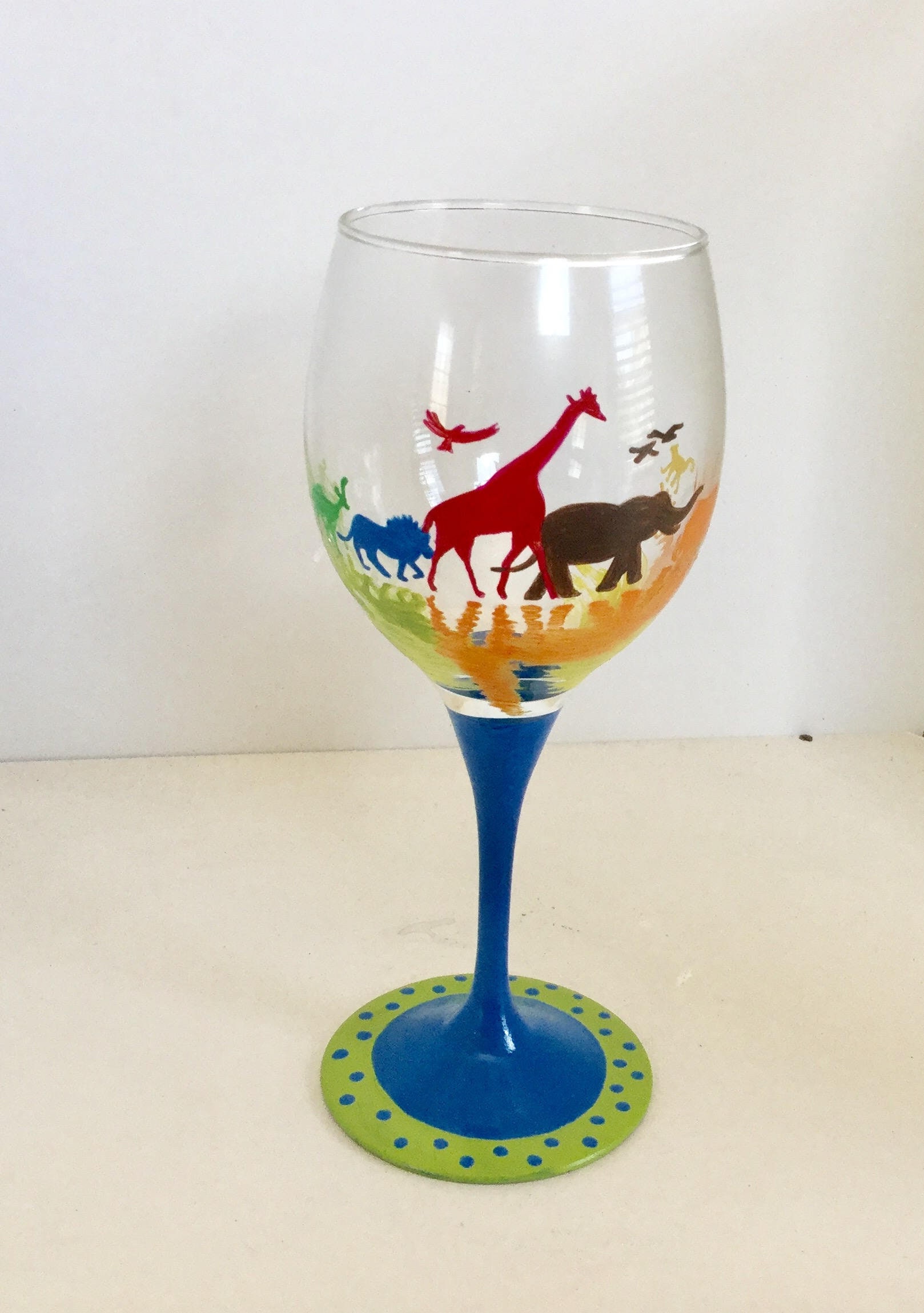 Hand painted wine glass. Glass measures 8" tall and holds 13 oz. Hand painted with enamel paint and heat set for durability. Hand washing is recommended. Back of glass can be personalized at no additional cost.