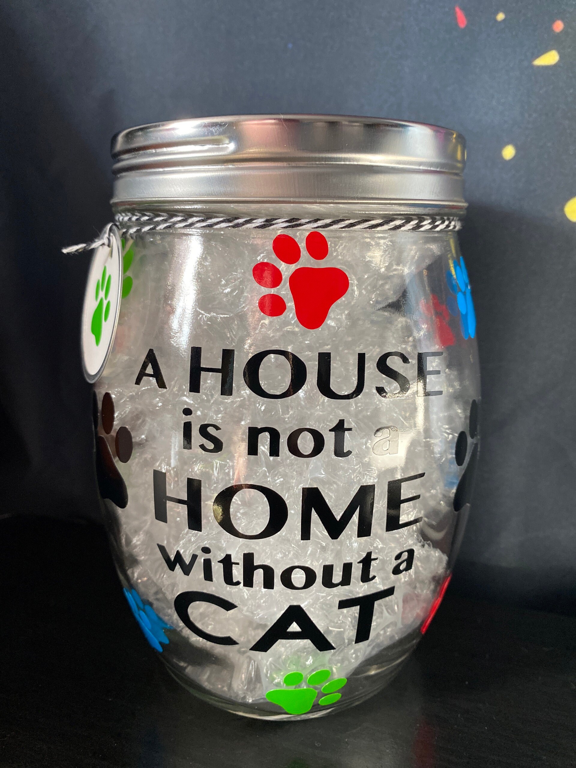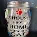 "A House Is Not A Home Without A Dog" in black vinyl on the front and comes with matching dog paw print tag attached. Back can be personalized with dogs name.