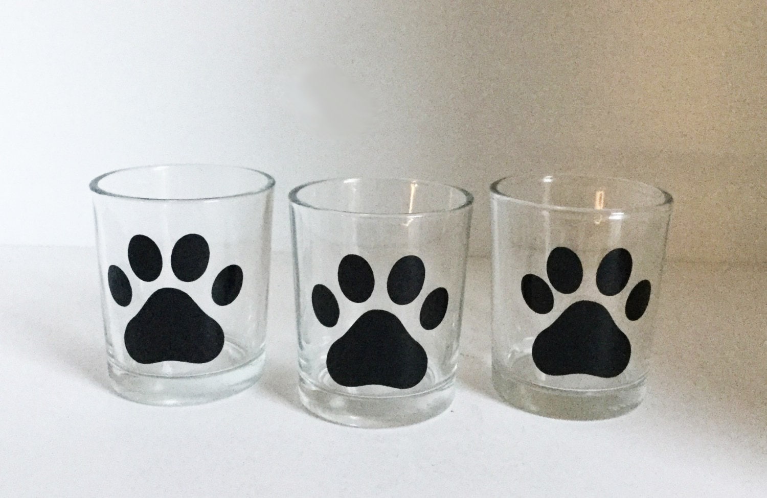 Set of 3 glass votive candles each hand painted with a simple paw print in your choice of color. Please put your color choice either in the personalization box or "note to seller" box.