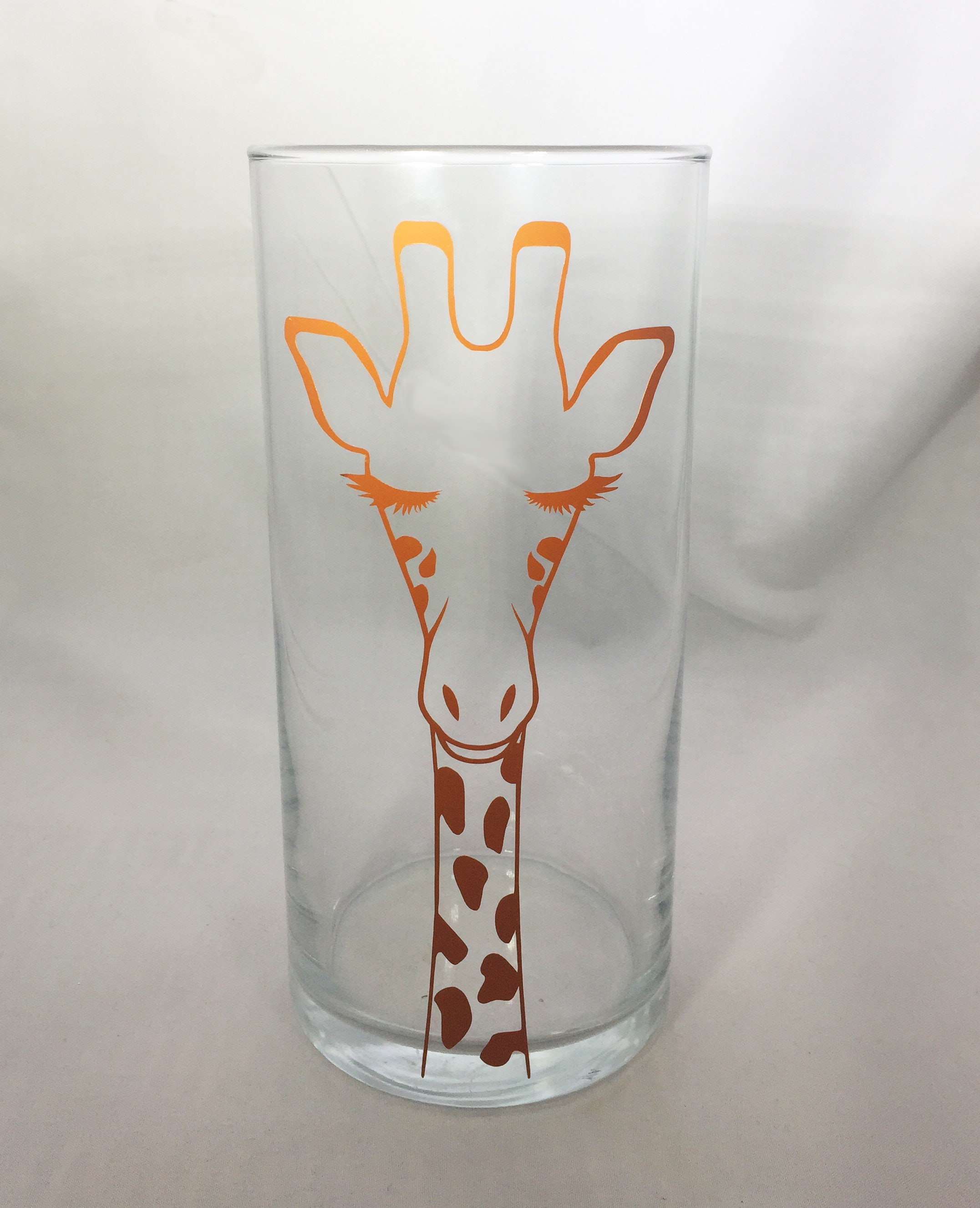 This 7 inch tall, 3.5 dia. cylinder vase features a cute giraffe design in vinyl. The contemporary cylinder design lends itself to a world of possibilities! Beautiful filled with a floral arrangement, equally striking with a floating candle, gemstones, rocks, or rose petals.