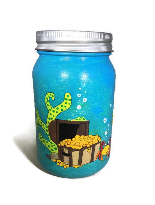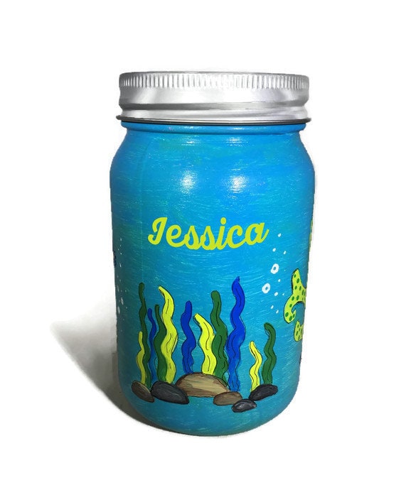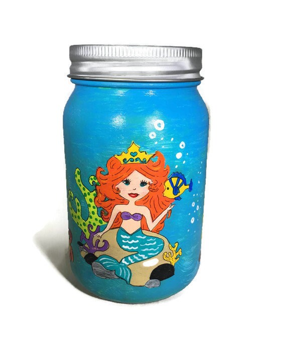 This hand painted mermaid 1 pint mason jar would make a great gift for any little girl. Comes with a lid with a slot for money.
