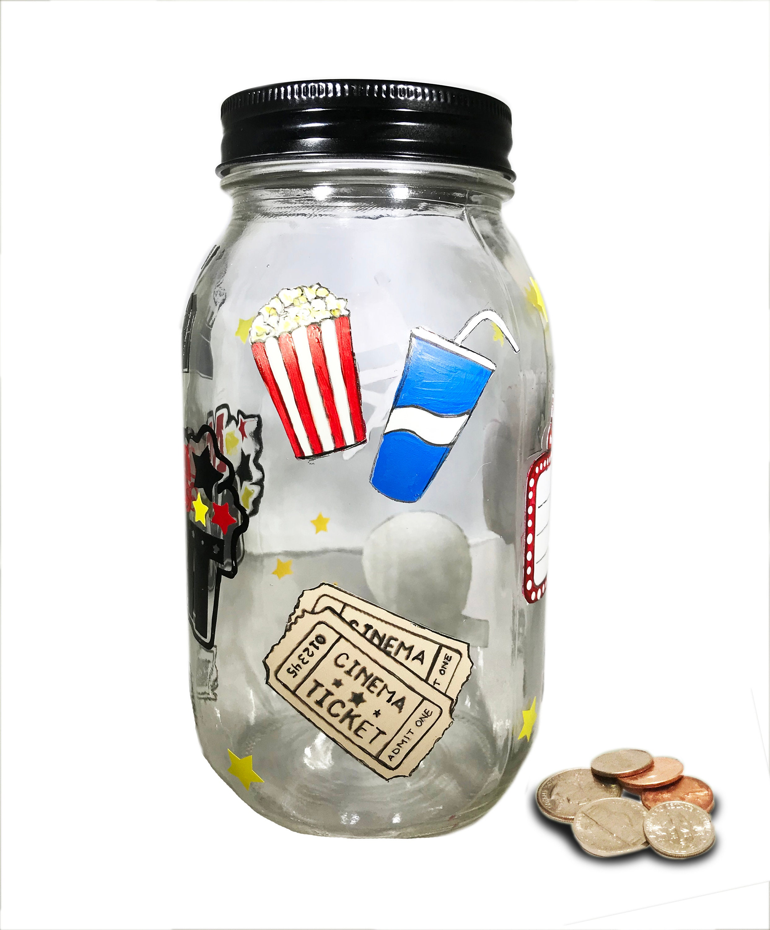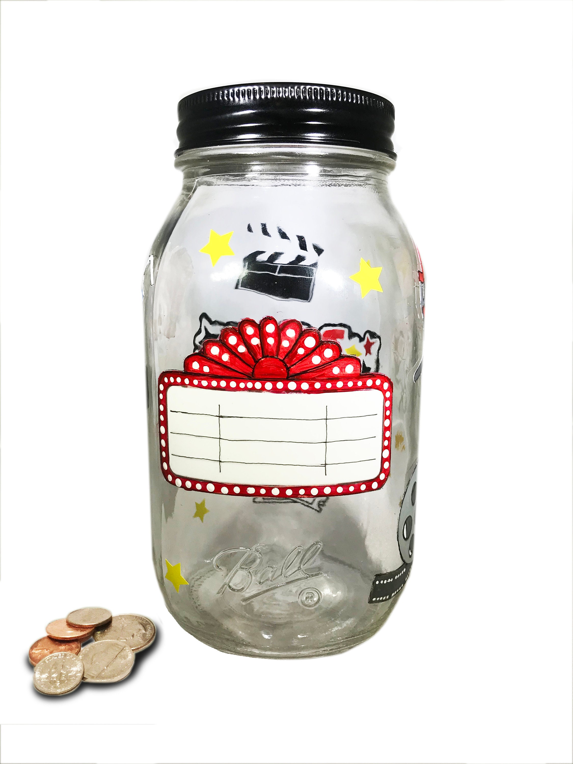 This mason jar bank is the perfect place to put away some money towards a night out at the movies. Also would make a great gift for a family or friend. The bank is hand painted and decorated with vinyl and comes with a lid with a slot in the top.