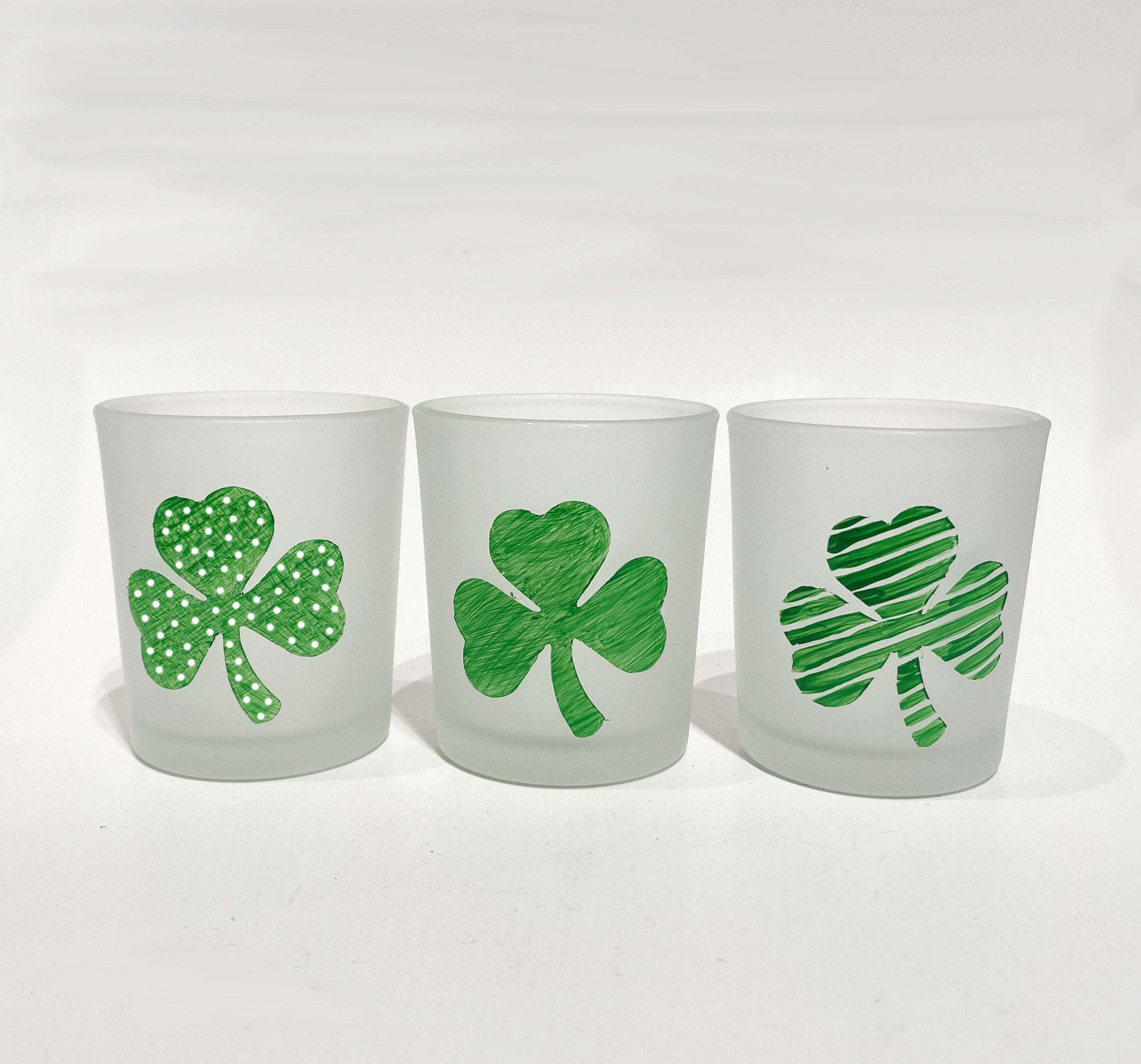 This frosted glass votive candle holder set features 3 different hand painted shamrocks. The perfect addition to your St. Patrick's Day decor.