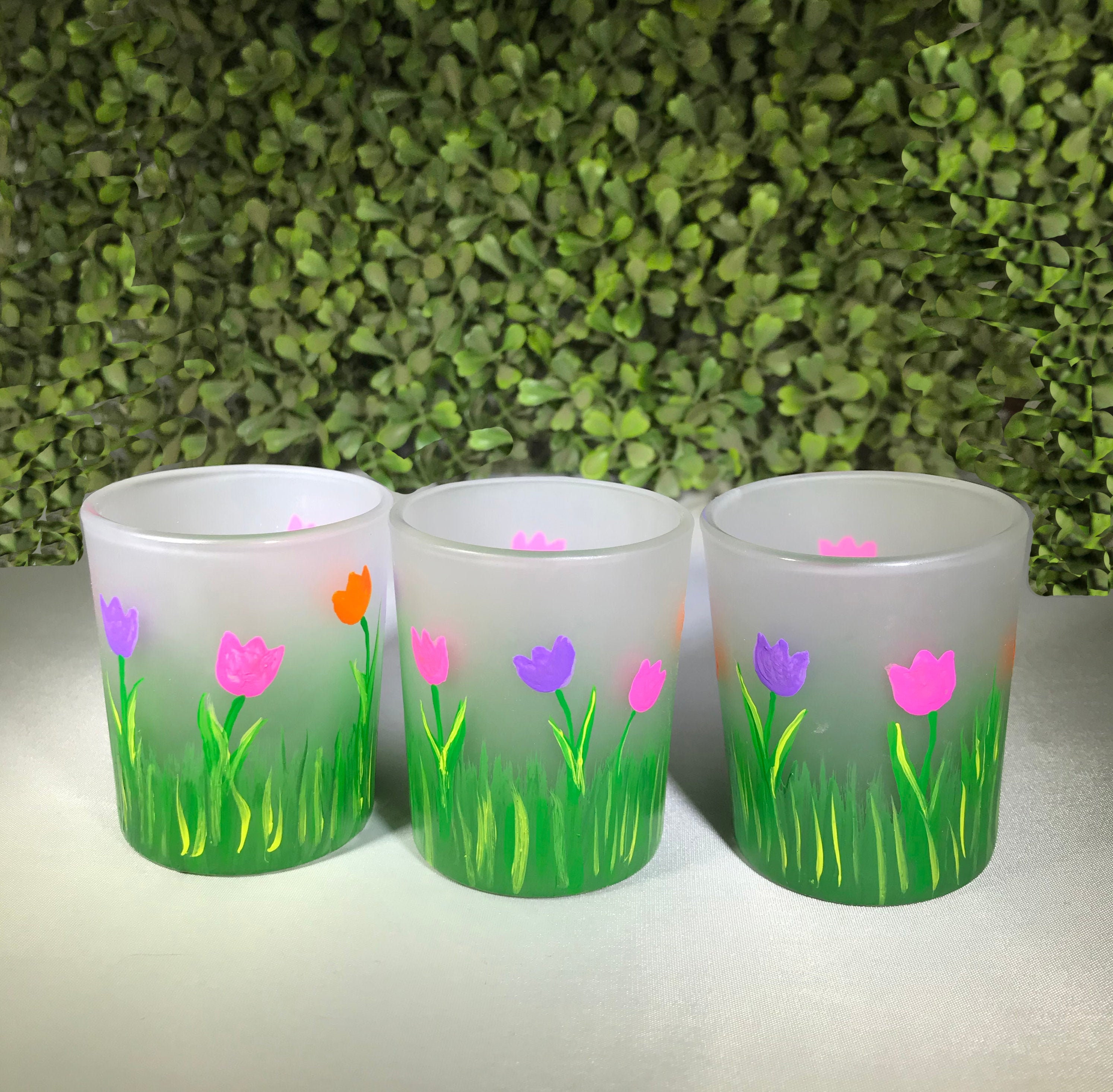 These frosted 2" x 2.5" extra thick premium quality glass votives feature hand painted tulips.